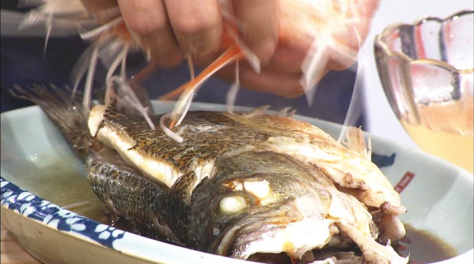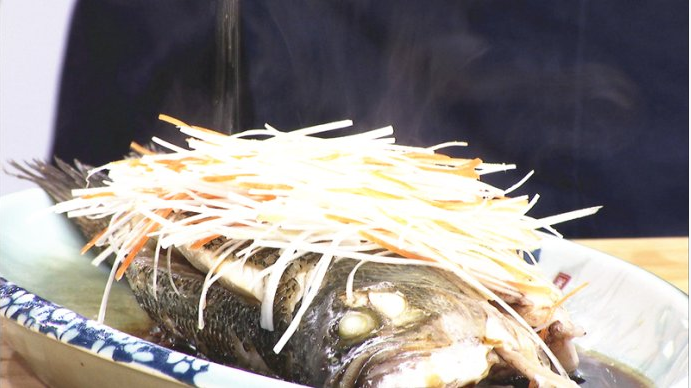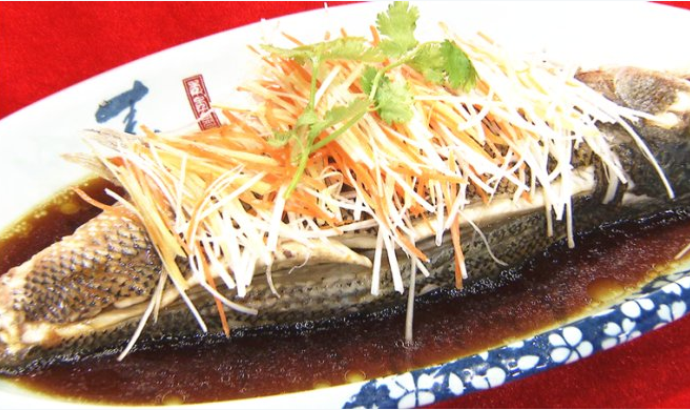 步骤3:鱼出锅后,浇上豉油汁,放上葱丝和胡萝卜丝。