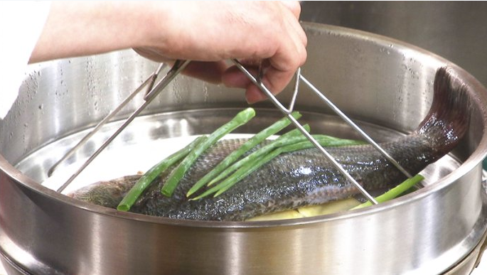 步骤1:将鲈鱼沿脊背开一刀,加入盐、料酒、橄榄油腌制10分钟。然后加入葱和姜,上气蒸6分钟,关火焖1分钟。