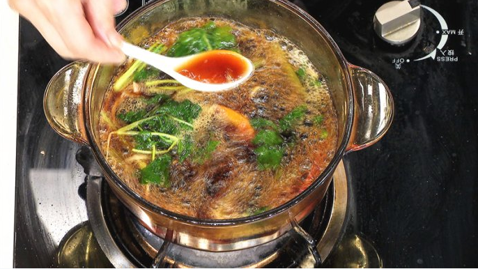 步骤2:用香菜根、芹菜叶、胡萝卜、洋葱等蔬菜制豉油汁。将蔬菜开水下锅,焯至开锅,放入;两颗冰糖。煮10分钟后,加入四份鲜味酱油,一分生抽,少许老抽。豉油汁就做好了。