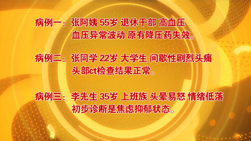 节目一开场,主持人就从档案袋中拿出了三份病历本,这三本病历属于三个不同的患者,分别来自于同仁医院心内科,神经内科和临床心理科三个不同的科室。今天这三个科室的医生也来到现场,为我们讲述了这三个病例。第一个病例,来自于一位55岁的女性,她有高血压,最近出现了异常的血压波动,原有的降压药失效了。第二个病例,来自于一位大学生,他有常年头痛,家人和患者自己都担心是不是脑部有肿瘤导致的。第三个病例是位上班族,他最近出现了极大的情绪波动,处于焦虑抑郁状态。这三个病例的背后,其实都是一个原因导致的,到底是什么原因呢?敬请收看由北京同仁医院耳鼻咽喉头颈外科主任周兵为您讲解的《“堵”出来的健康隐患》。