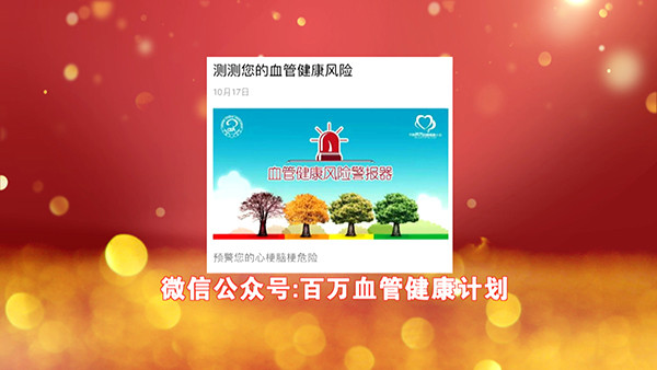 2016年,中国卒中学会组织了针对大众健康的《中国百万血管健康计划》,这个计划会帮助广大患者,及早发现患脑中风的风险。通过一个免费的微信公众账号,就可以自己在家进行测试,具体如何操作呢?敬请关注本期节目。