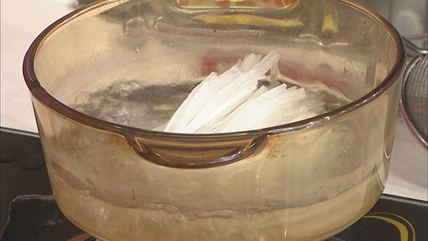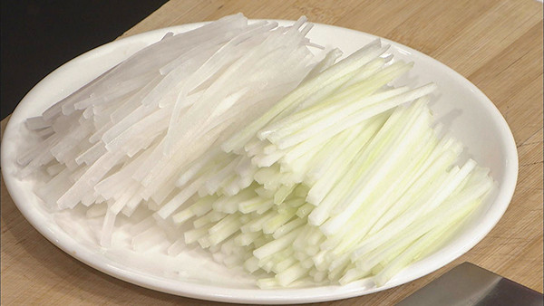 步骤2:白萝卜切丝,开水下锅焯煮后,捞出过凉。