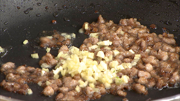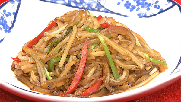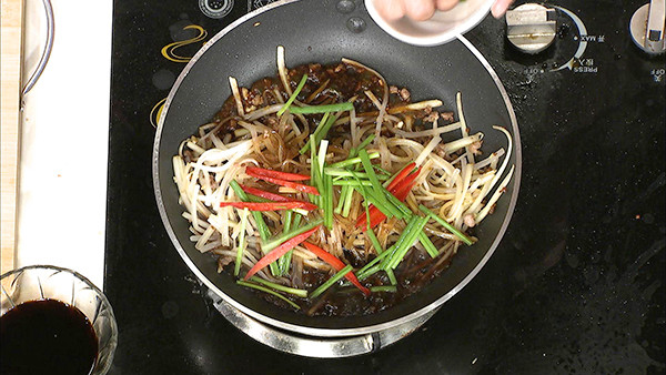 步骤4:白菜下入锅中,翻炒至塌秧,下入萝卜丝,烹入碗汁,快速翻炒均匀即可。