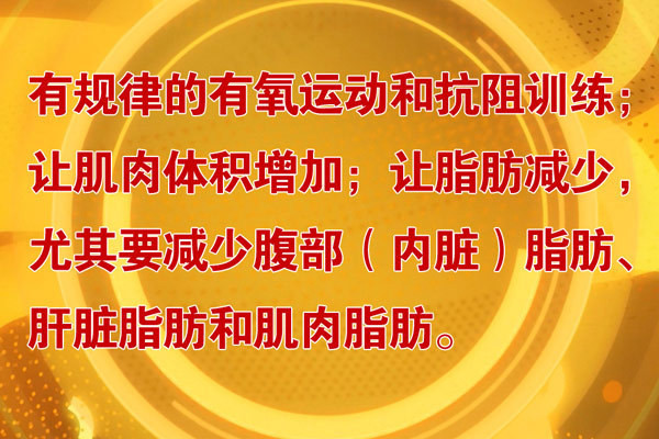 其实有很多方法可以增加胰岛素的敏感性。比如说有规律的有氧运动和抗阻训练,让肌肉体积增加,让脂肪减少。杨主任建议大家:运动要遵循一三五七的原则,一是每天至少运动一次。三是有效运动要持续三十分钟以上。五是每周至少运动五天。七是运动心率要达到170减去年龄。