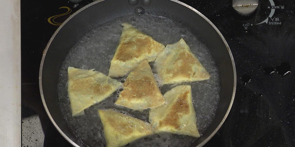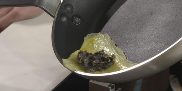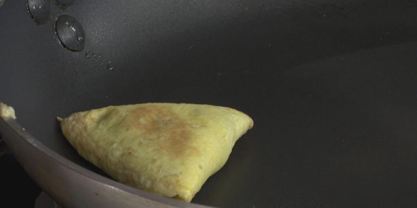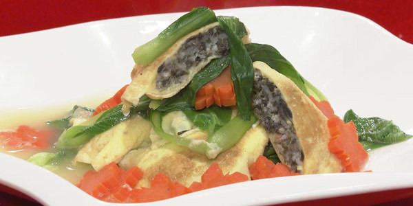 4:蛋皮底面定型后,立刻将馅料加入,并折蛋皮包裹均匀,包好后继续在锅中受热,蛋皮完全定型后盛出备用。