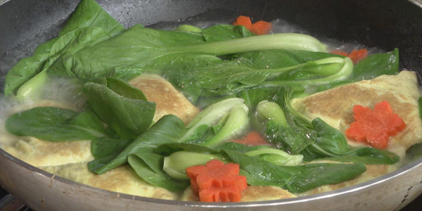 6:锅中再加入胡萝卜片和油菜心,调入胡椒粉后盛出食用。