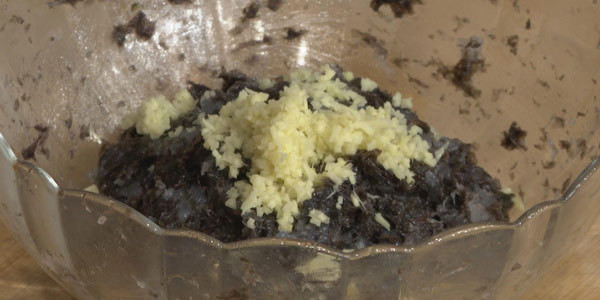 1:紫菜用水清洗,搓散后加入到切成泥的虾肉中搅匀,再拌入姜末备用。