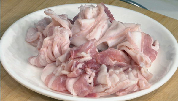步骤1:将速冻过的五花肉切成极薄的片,加少许米醋抓拌均匀。