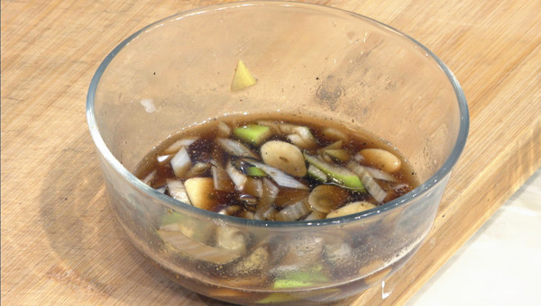 步骤2:小碗中加葱、姜、蒜片,再调入7份的米醋和1份的白胡椒,两者的用量较平时都要多些许,再调入小半勺料酒和小半勺清水,最后加2克左右的盐和糖搅拌均匀。