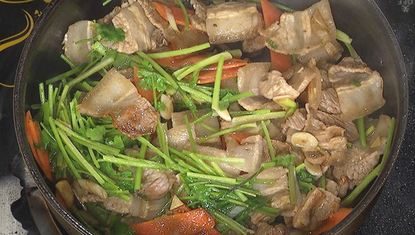 步骤4:锅再烧热,下入五花肉,同时下入葱、姜、蒜和胡萝卜片翻炒均匀,再下入配好的碗汁,放入香菜梗炒匀关火,滴少许料酒盛出食用。