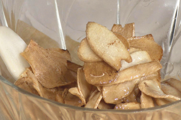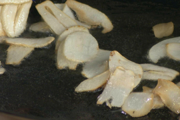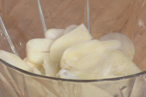 步骤1:大蒜去皮切薄片,下锅煎至表面微黄,盛出放凉备用。