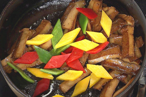 2:锅中继续下入香干,用蒜油煸至焦香,下入三色彩椒,烹入辣椒酱、盐、糖、生抽,勾芡出锅,撒蒜片一同食用。