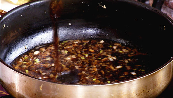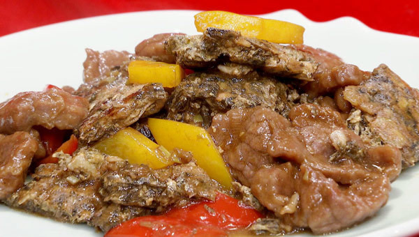 4:另起锅,爆香葱花,加入两勺料酒、酱油、醋,加少许白糖、盐,下入紫菜角、牛肉、彩椒翻炒均匀即可。