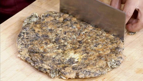 3:五成油温下锅煎紫菜蛋饼,表面金黄后盛出,切三角块备用。
