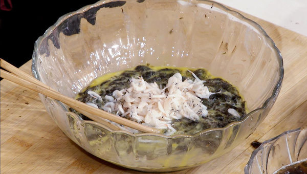 2:在蛋液中加入紫菜、虾米皮搅拌均匀。