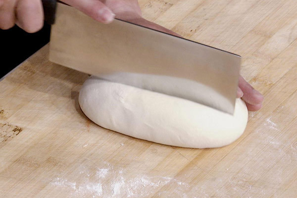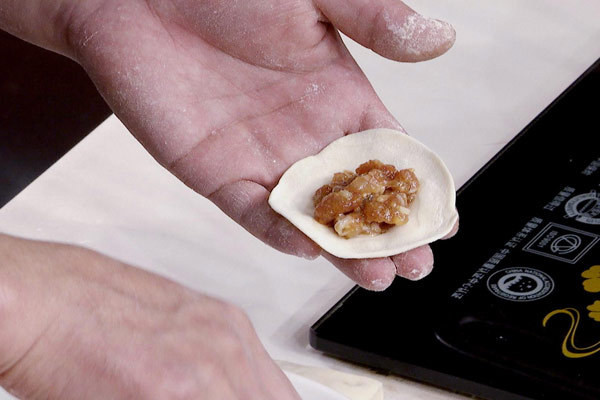 3:包制灌汤包:加入肉馅后,放入一小块肉皮冻。