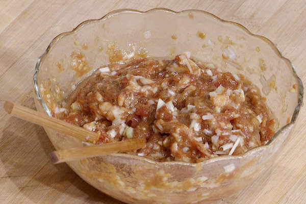 1:调馅:猪肉馅和虾仁混合后,加入姜末,生抽、料酒、食用油搅拌均匀,最后放入葱花。