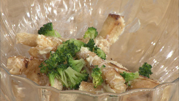 步骤3:炕好的油条盛出后,加蛋黄酱和焯熟的西兰花拌匀,即可食用。