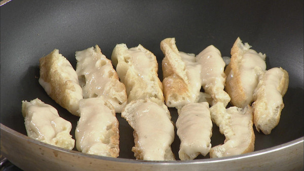 步骤2:将虾泥放入到切好的油条中,小火炕5分钟左右。