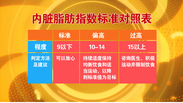 腹型肥胖及内脏脂肪超标,是2型糖尿病最显著的高危因素。在节目现场,李林和刘婧分别进行了基础代谢率、全身脂肪含量和内脏脂肪含量的检测,如果您也做过相应测试,可以对照下表看看您的数值是否健康。如果您的基础代谢率偏低,说明代谢较慢,容易积累能量,在摄入不变的前提下更容易发胖;如果全身脂肪含量偏高,还要进一步关注内脏脂肪的含量,因为与全身均匀肥胖的人相比,内脏脂肪多,也就是腹型肥胖的人群更容易发生2型糖尿病,且与心梗、脑梗等致死性并发症关系更密切。