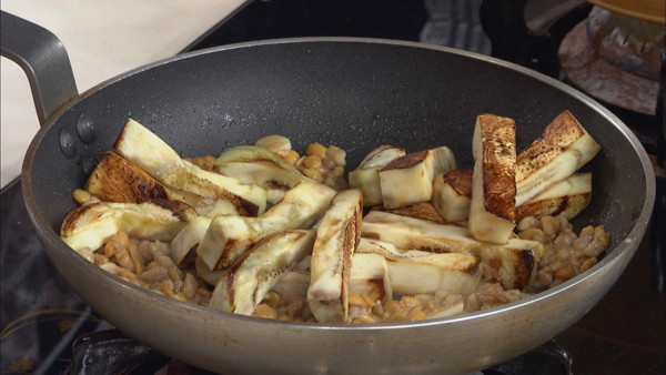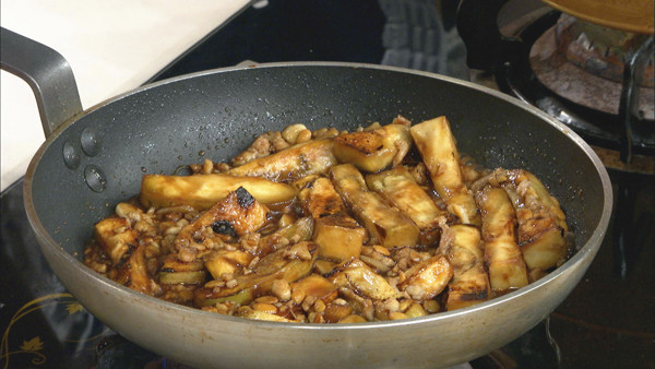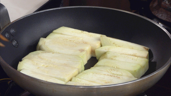 步骤1:圆茄子去皮,切成条,下锅小火干焙至上下两面焦黄,盛出备用。
