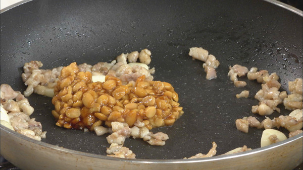 步骤2:锅中煸入鸡肉粒和蒜粒,鸡肉煸香后再下入普宁豆浆煸炒均匀。