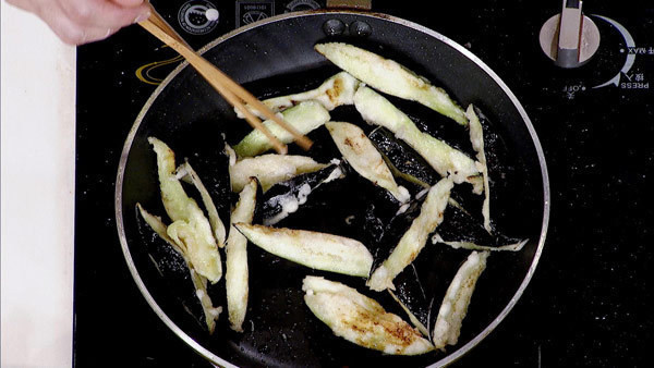 步骤3:六成油温,将茄子煎至金黄色,倒出多余的油脂。