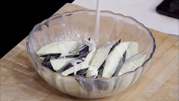 步骤2:在茄子上撒上盐和干淀粉,摇匀,倒入和好的糊,再摇匀。