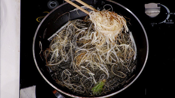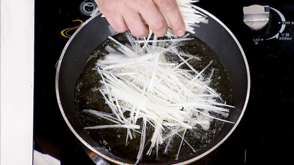 步骤2:3成油温下锅炸制葱丝,加入一个香菜根,待葱丝微黄捞出备用。