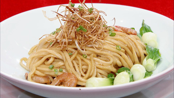 步骤4:将混合好的葱油加入面中,放少许海苔、油菜、炸葱丝拌匀即可。