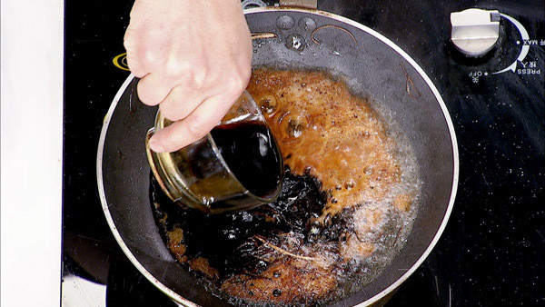 步骤3:锅中留少许葱油,加入一碗生抽,小火熬煮后,将酱油、葱油和海米混合。