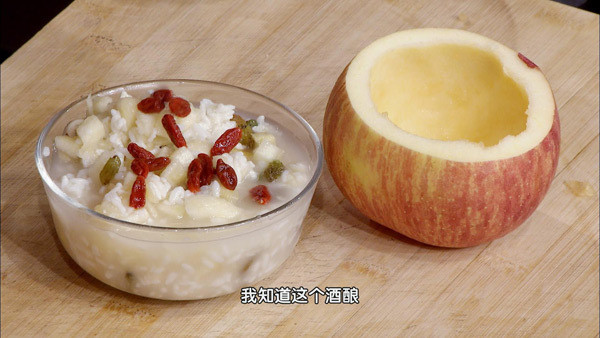 步骤3:将调好的酒酿下导入苹果盅里,盖上盖,上气蒸20分钟。