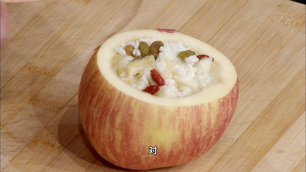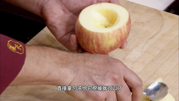 步骤1:将苹果洗净,切掉上盖,用勺子挖掉苹果肉,制成苹果盅。