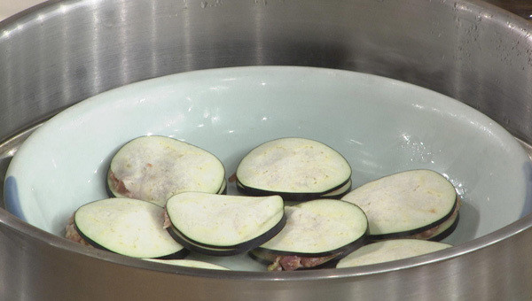 步骤4:茄盒做好后放到平碗中,倒入调过味的鸡蛋液,上气蒸5分钟左右,即可出锅食用。