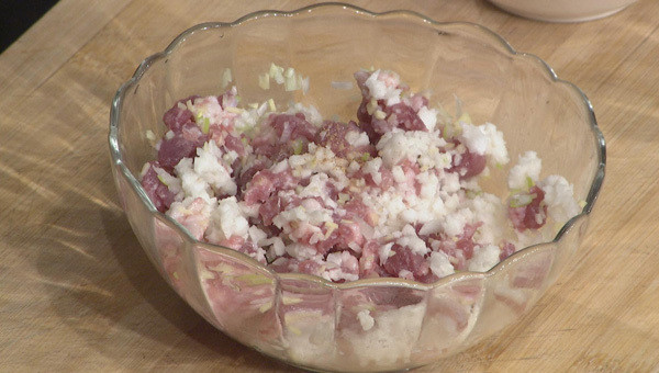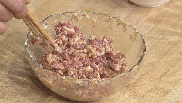 步骤2:猪肉馅中加入葱末、姜末、荸荠碎搅拌均匀,再拌入五香粉、生抽、料酒,向着一个方向搅拌上劲。