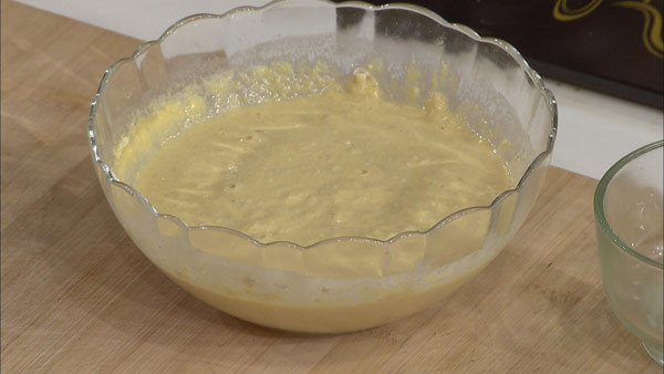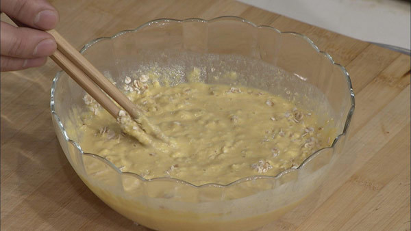 步骤1:将两份的玉米面,搭配一份的白面粉,再搭配一份的奶粉,加鸡蛋搅匀,再倒适量菊花水搅拌。
