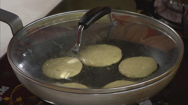 步骤3:锅中刷少许油,用勺子下入面糊,下好后中小火盖盖儿烘制。