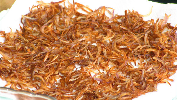 步骤1:小洋葱切丝,炸至金黄色后盛出备用。