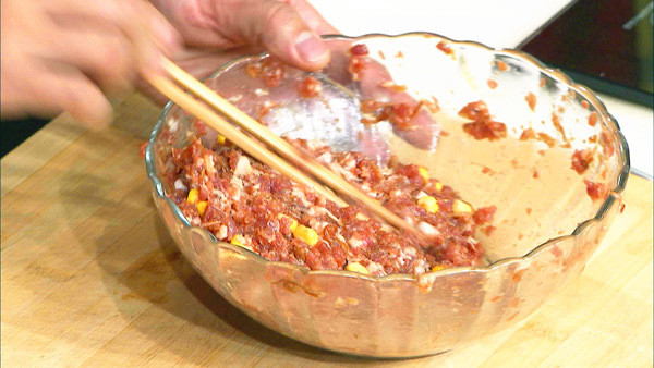 步骤2:猪肉馅中加入盐、生抽、清水、炸好的小洋葱丝和玉米粒。
