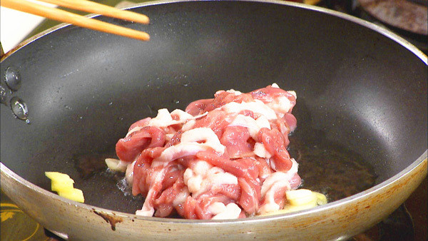 步骤2:锅中倒入底油,放入鸭胸肉片和葱姜煸炒。