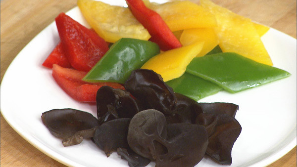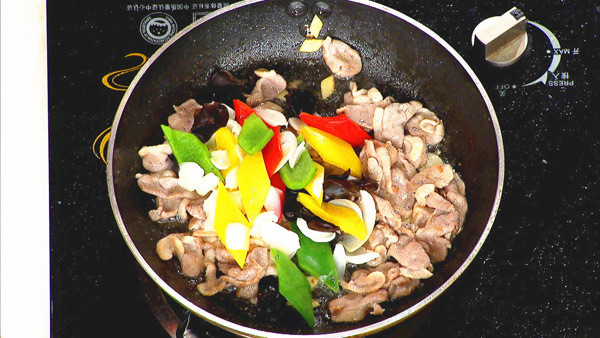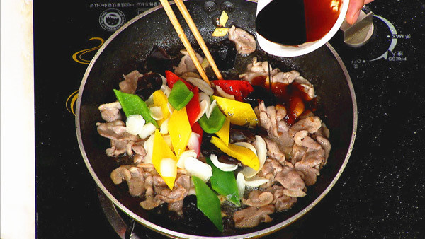 步骤3:放入木耳、彩椒、百合,再放入蚝油和老抽调味。