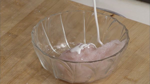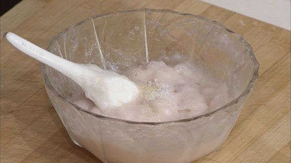 步骤3:将调好的水淀粉放入鱼肉中,再加入适量葱姜水。