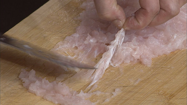 步骤1:将龙利鱼用刀背砸成泥,再用刀刃刮出鱼肉中的筋膜。