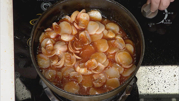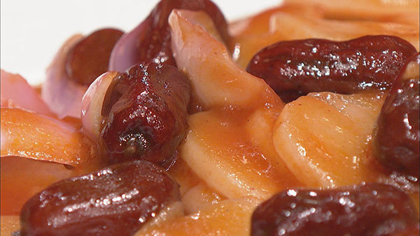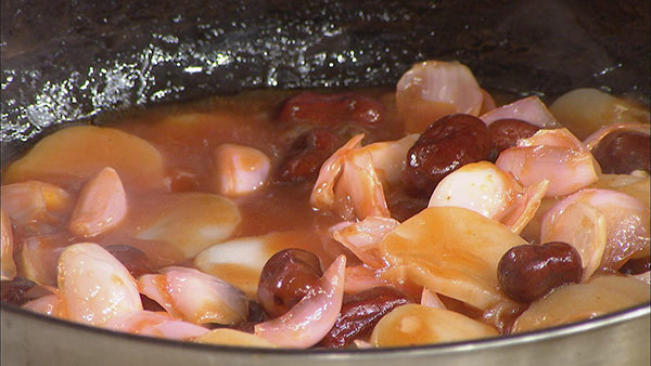 步骤5:年糕、百合、小枣全都炒匀上色后,加少许水淀粉勾芡出锅。