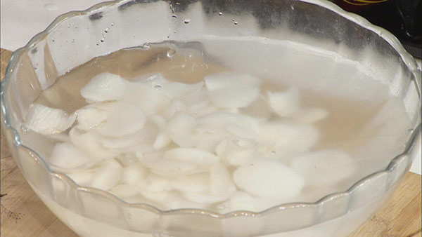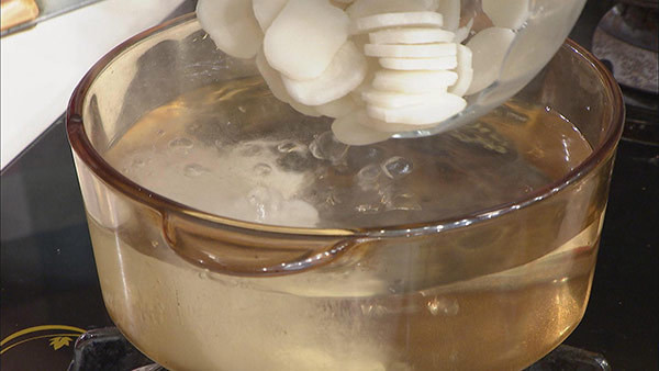 步骤2:年糕煮开锅后,下入白醋泡过的百合,烫一下就可以和年糕一同捞出,放到凉白开中过凉。
