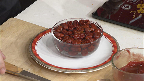 步骤4:烧开后加入过凉的年糕和百合炒制,炒匀后再加入开水泡开的小枣一同翻炒。