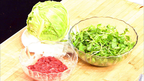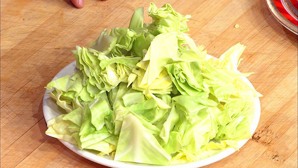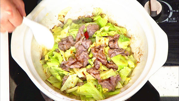步骤3:放入包菜和牛肉煸炒,放入酱油、盐、糖、料酒调味。