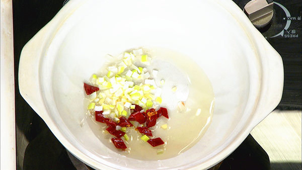 步骤2:砂锅中放入底油,放入葱姜蒜和辣椒煸炒。