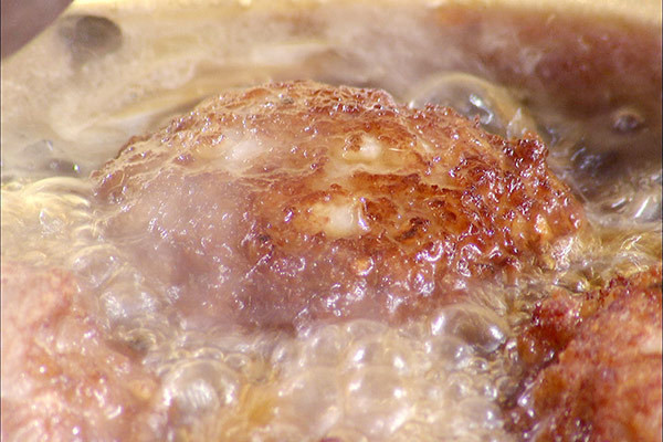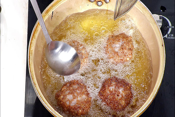 3:4成油温下锅,丸子炸至金黄色后捞出。