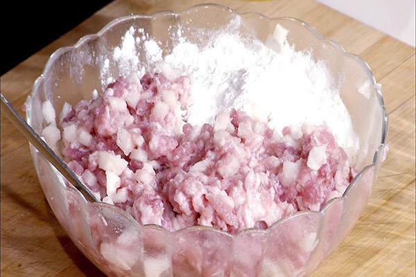 1:肉馅中加葱姜水、盐、雪梨碎、荸荠碎、干淀粉搅拌均匀。